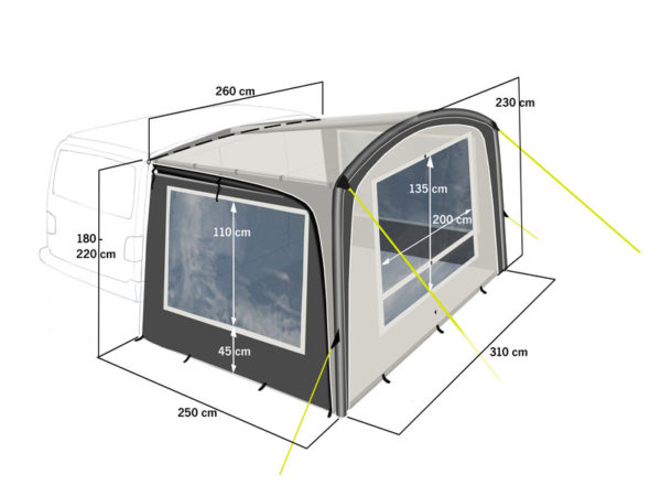 Kaikki seinät saa kokonaan auki jolloin teltasta tulee markiisi