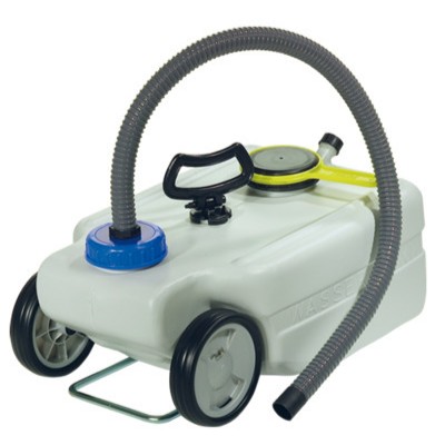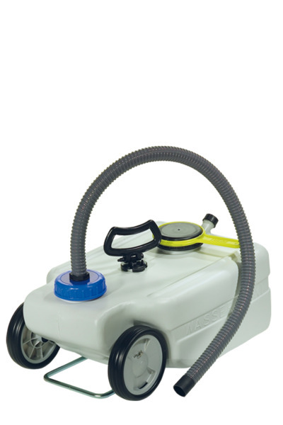 Tuore- tai jätevesitankki. Ulosvedettävä kahva ja kaksi pyörää. Helppo täyttää ja tyhjentää: 1 korkki 3/4′, 1 DIN 96, 1 valinnainen avaus DIN 96.