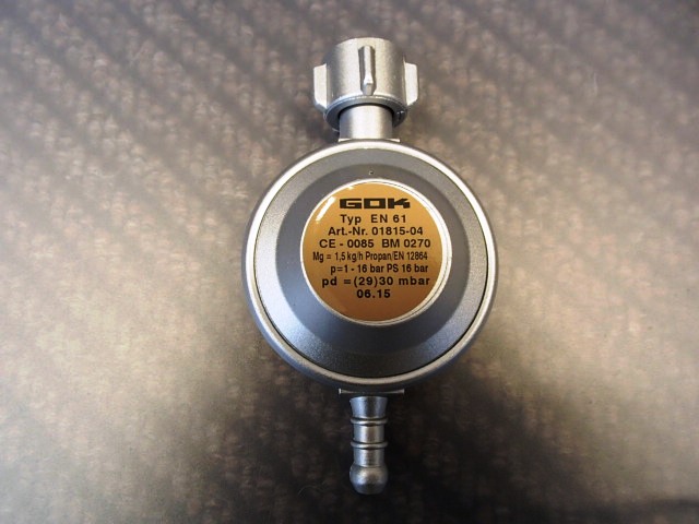 Kaasupaineensäädin 30 mbar 1,5kg/h 16bar, kierreventtiilikaasupullolle ja klemmarilähtö kaasuletkulle, esim.grillin pikaliitinletkulle.